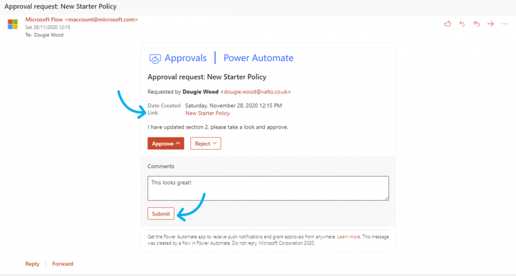 All of this is done within the email, as it provides a link to the relevant document and two buttons with an additional comments box as shown below: